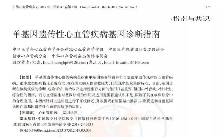 2019年3月24日,《中華心血管病》雜志發(fā)表了一項重要指南《單基因遺傳性心血管疾病基因診斷指南》,標(biāo)志著心血管疾病診療向精準(zhǔn)化、個體化方向邁出堅實一步。