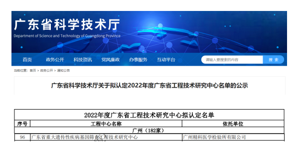 2023年1月6日,廣東省科學(xué)技術(shù)廳發(fā)布《廣東省科學(xué)技術(shù)廳關(guān)于擬認(rèn)定2022年度廣東省工程技術(shù)研究中心名單公示》,2022年度省工程技術(shù)研究中心名單正式揭曉,廣州精科醫(yī)學(xué)檢驗(yàn)所有限公司赫然上榜,獲批“廣東省重大遺傳性疾病基因篩查工程技術(shù)研究中心”。